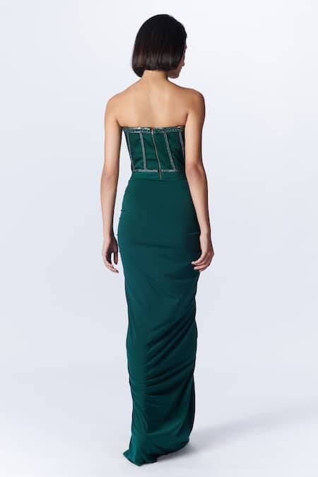 Green strapless gown featuring a corset bodice and draped design