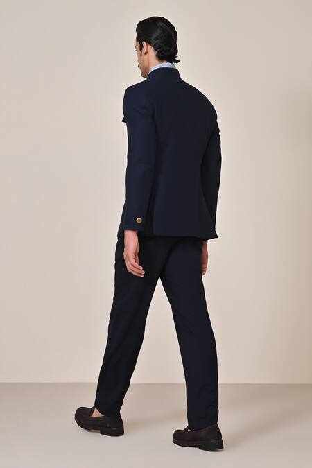 Navy bandhgala featuring faux leather and metallic stud placement embellishment in crest pattern
