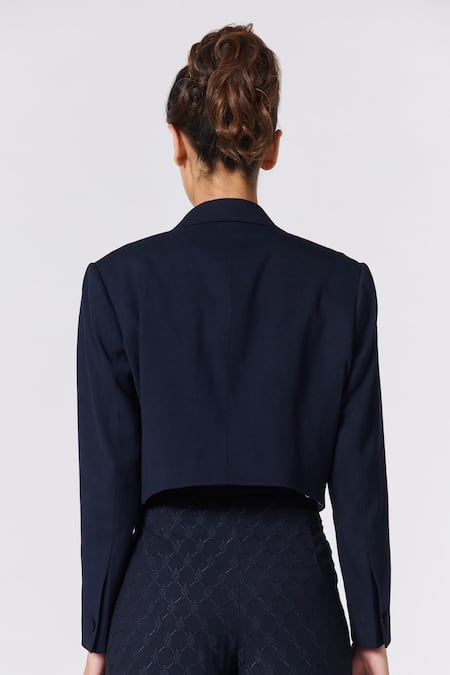 Navy blue crop jacket featuring a lapel collar and full sleeves with embroidered cricket club crest pocket detailing