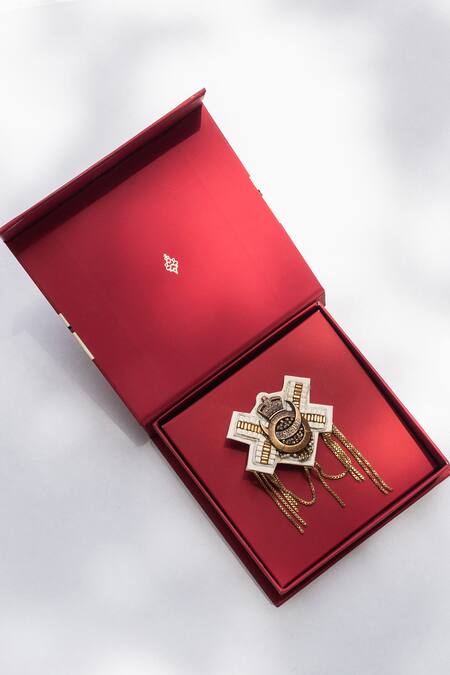 Off White Beads, Chains Cut Work Embellished Crest Brooch