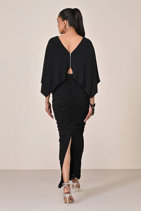 Black crop top featuring V neckline, draped sleeves, and cutdana with sequin embellishments