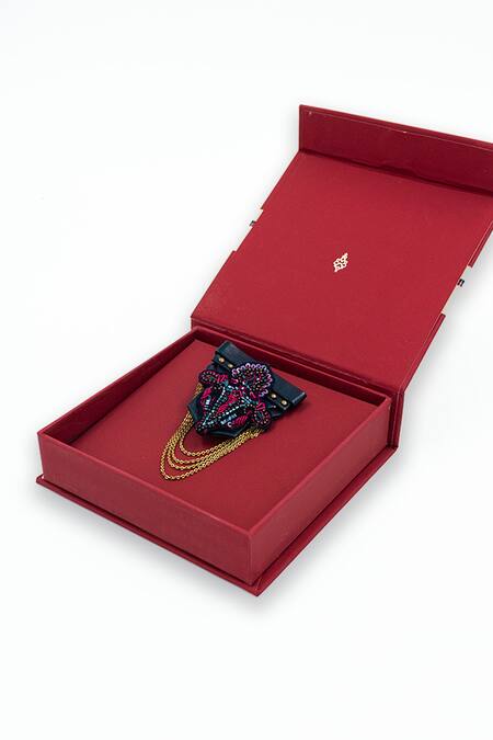 Navy and pink dual color brooch featuring intricate embroidery and metallic chain tassels