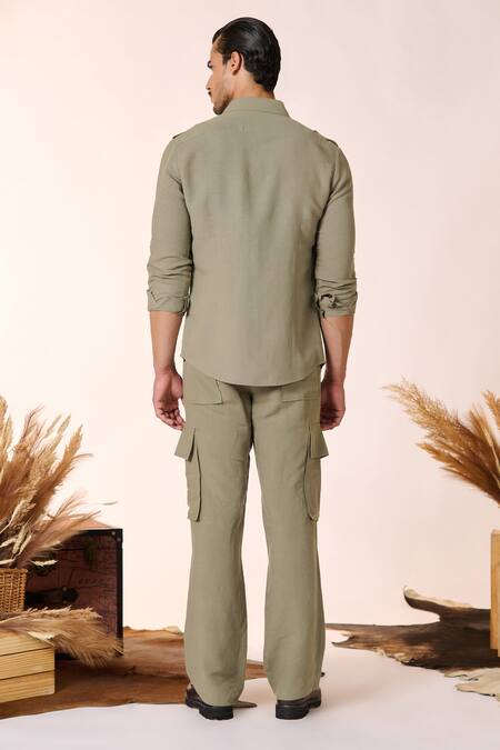 Green Linen, Rayon Embroidery Embellished Flap Pocket Shirt