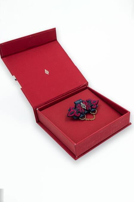 Navy Adamas brooch featuring intricate pink embroidery and faux leather