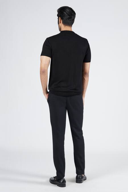 Black knit t-shirt featuring a raised neck and faux leather crest detailing
