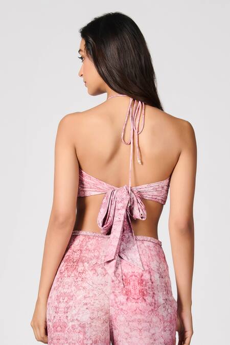 Pink bustier featuring floral geometric tonal print on a pleated base with D-ring