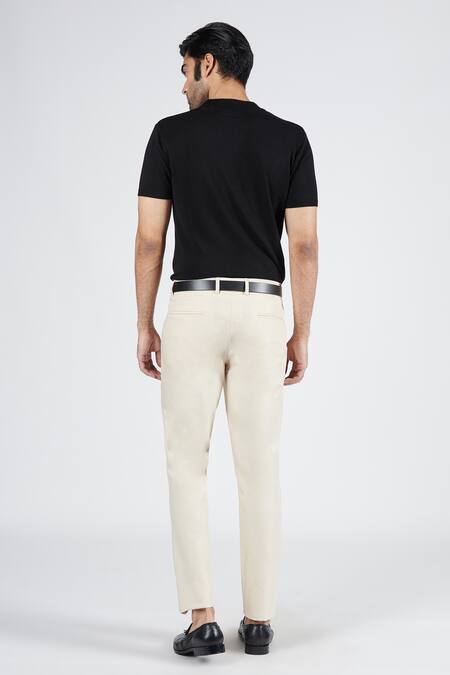 Off-white trouser featuring kantha work on the pocket and faux leather detailing on the hem