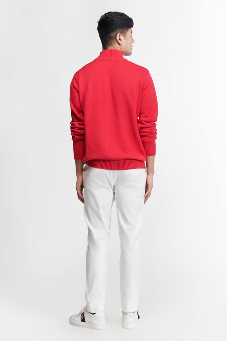 Red knitted sweater featuring SNCC patchwork logo, ribbed neckline and sleeves