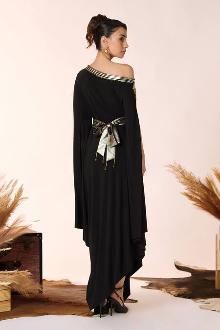 Black kurta featuring a one shoulder design with asymmetric slit sleeves and a draped hem. Accompanied by a faux leather rust belt for added style.