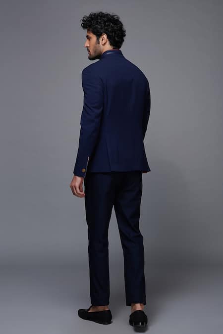 Blue Wool, Viscose, Poly Blend Mandarin Collar Bandhgala