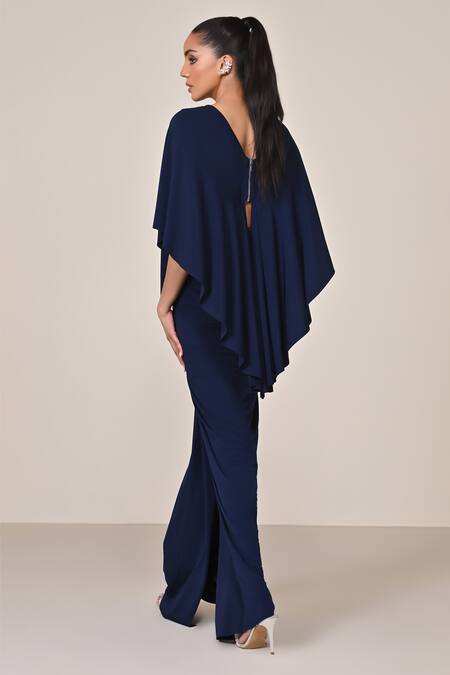Navy draped gown featuring a V neck, flared sleeves, and a back zip closure