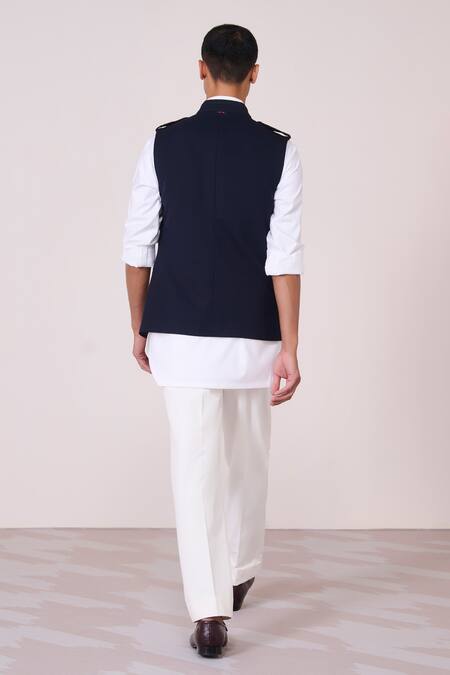 Navy waistcoat featuring faux leather accents and tape detailing
