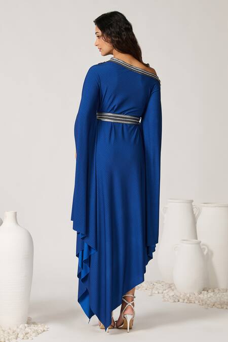 Blue draped maxi dress featuring an asymmetric neckline with geometric print