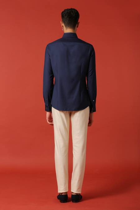 Navy blue shirt with detailed Nehru-collar & placement embroidered crest.