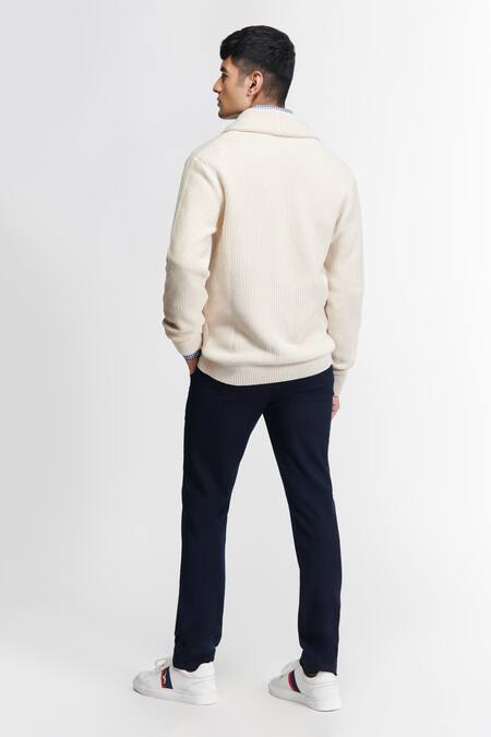 Off white knitted cardigan featuring placed embroidered crest and carved buttons