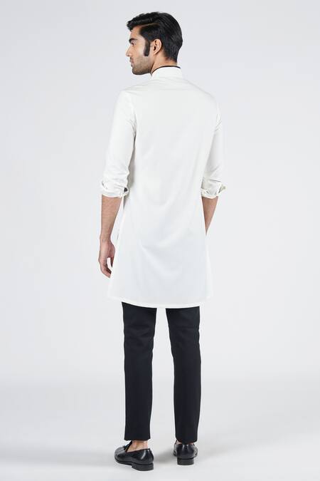 Off-white kurta featuring faux leather details on the collar and sleeves, with printed panel details finished with faux leather laser cut elements