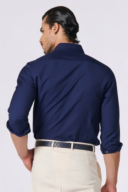 Blue Lycra, Viscose Plain Stand Collared Shirt