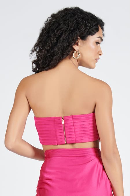 Pink strapless corset top featuring all-over horizontal pleats