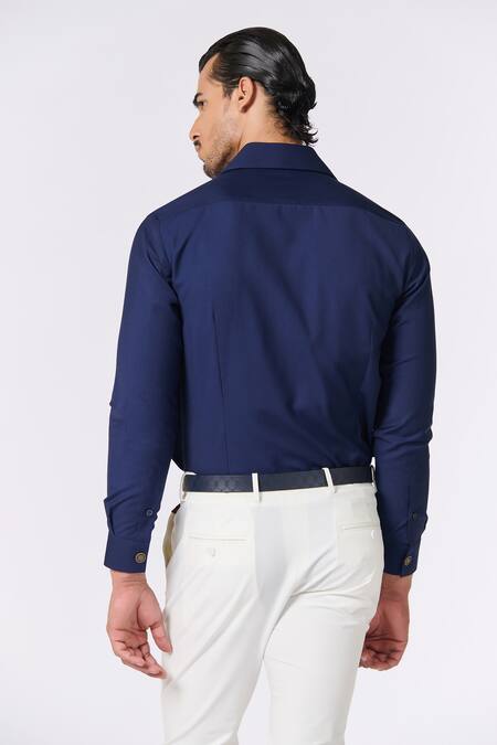 Navy shirt featuring full sleeves, collar neckline, and abstract print on the placket