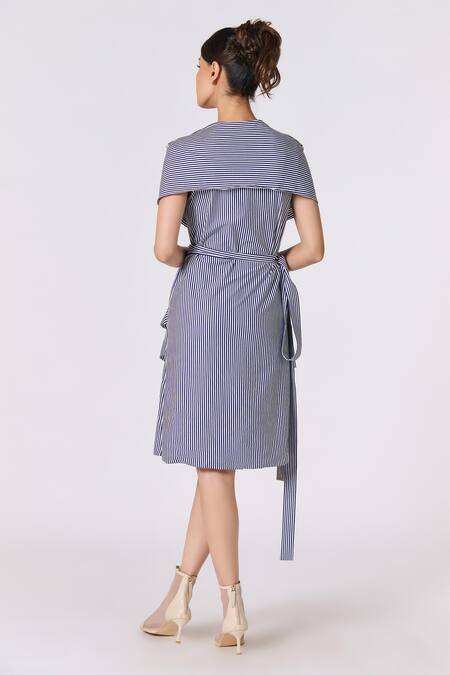 Navy blue and off white striped dress featuring a V neck and cape sleeves