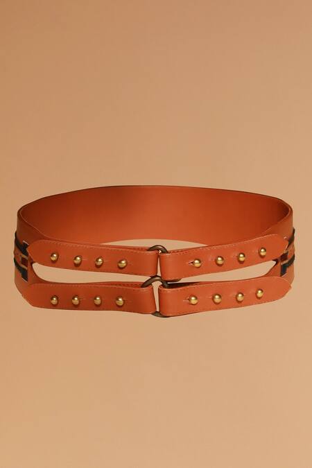 Tan leather waistbelt featuring cutout details and metallic press studs