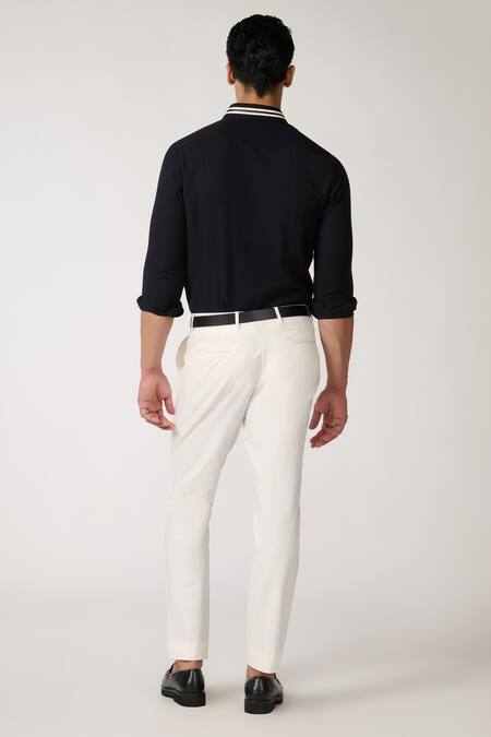Black shirt featuring tape placement embellishment on the placket and collar