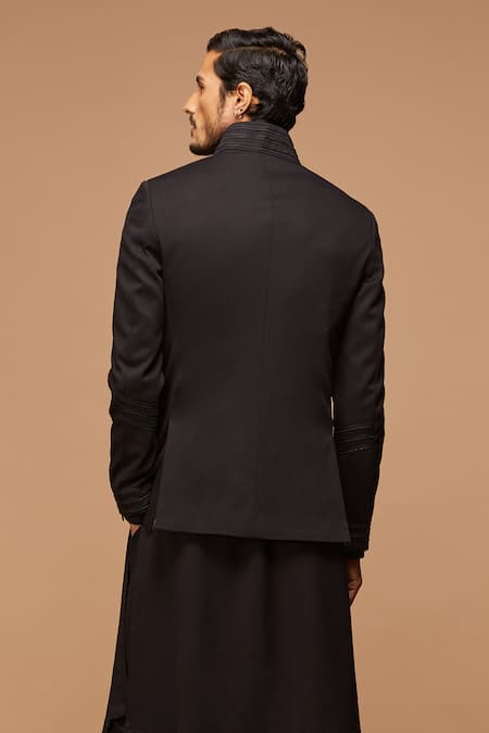 Black knit-cotton bandhgala with pastiche details on collar- front panel, woven tape on pocket & pleat-style texture.