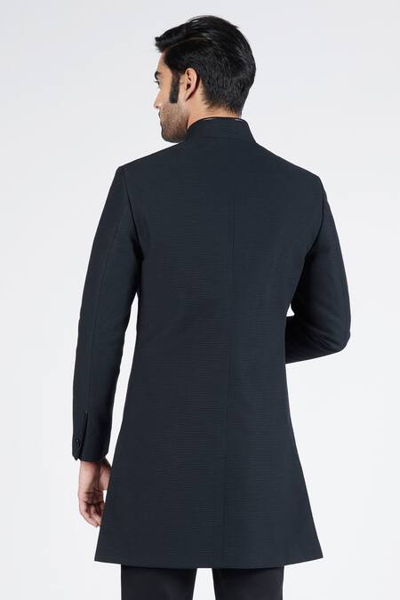 Black textured sherwani featuring faux leather on the Nehru collar and faux leather buttons