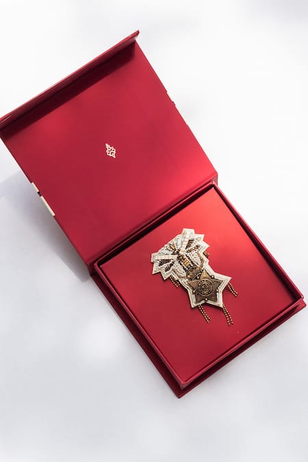 Off White Cut Work, Beads, Embroidery Thread And Dana Crest Brooch