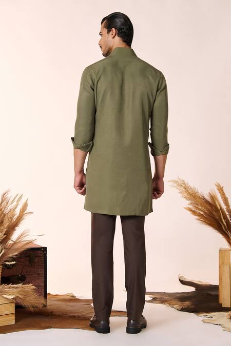 Green kurta featuring thread embroidered logo crest on side and striped tape accents