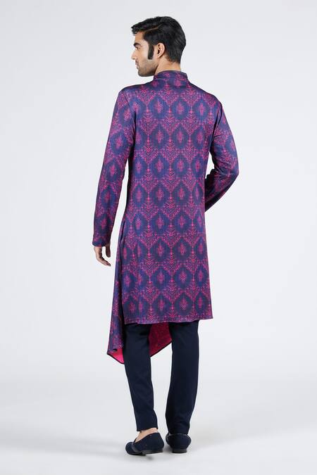 Navy draped kurta featuring all-over tribal prints and cuff sleeves