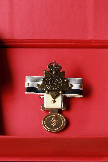Off-white handcrafted brooch with Adamas coin, tape detailing, metallic crest and embellished rivet-studs.