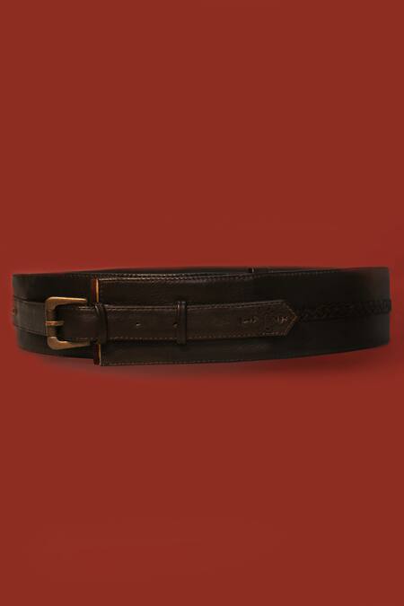 Chocolate brown belt featuring a push-pin buckle and braided trim detail