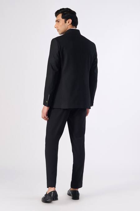 Black woven textured bandhgala featuring placed tone-on-tone faux leather detailing and metallic gold buttons