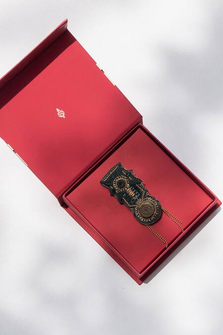 Emerald green faux leather brooch featuring intricate tonal embroidery with carved work, cut dana, zari, and bead embellishments