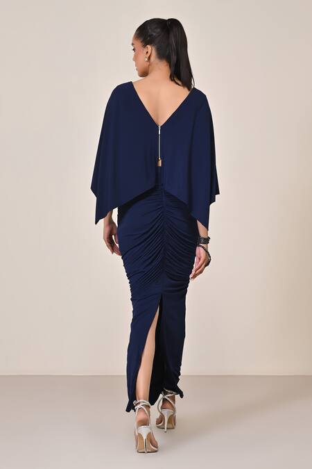 Navy crop top featuring a V neckline, draped sleeves, and embellished with cutdana and sequin details