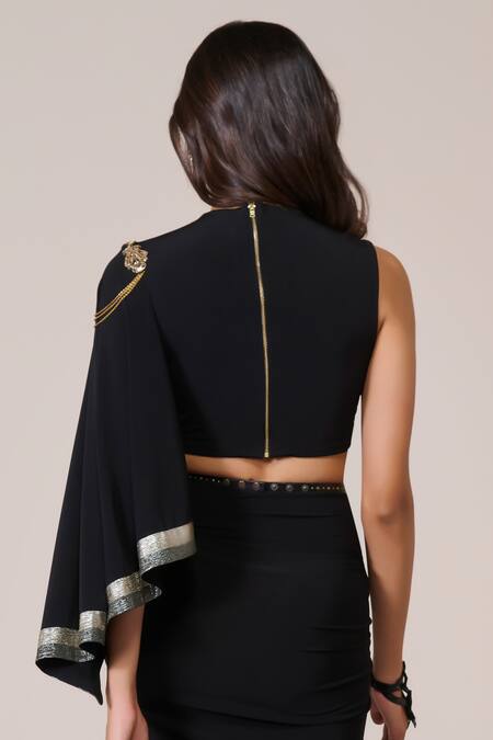 Buy_S&N By Shantnu Nikhil_Black Jersey, Spandex Asymmetric One-sleeve Top_at_Aza_Fashions
