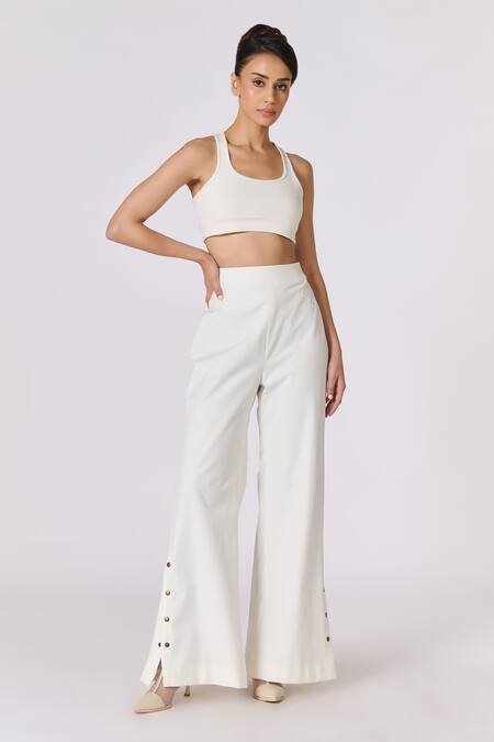 Off White Denim Embroidery Placement Embellished Flared Trouser