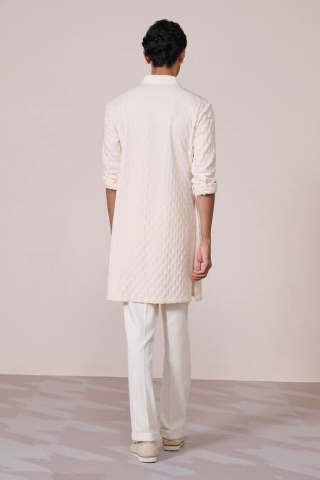 Offwhite kurta featuring faux-leather detailing on the Nehruvian collar and tape detailing on the placket