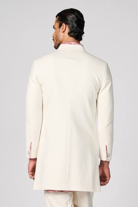 Off white sherwani featuring a stand collar and full sleeves