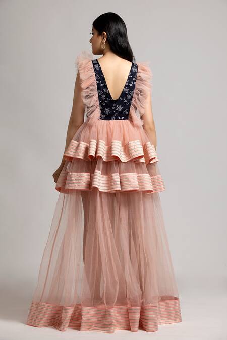 Peach tiered gown with navy blue panel on the yoke and floral embroidery.