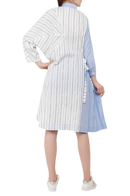 Blue & white shirt dress with asymmetric hem, striped detail & side tie-up.