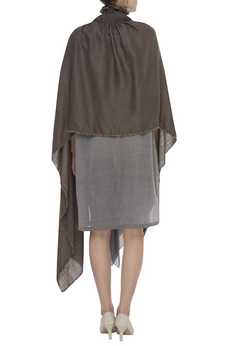 Brown scarf made from merino cotton wool featuring a pleated neck design and an uneven hemline