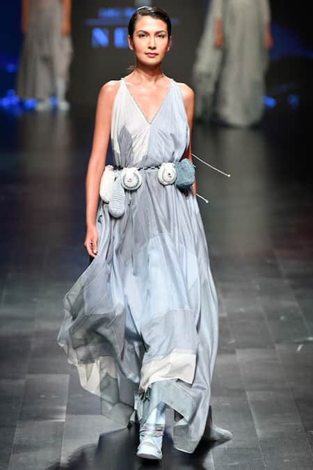 Grey & blue flared gown with plunging neckline.