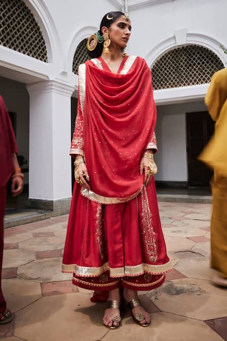 Red anarkali featuring zari and gota hand embroidery. Paired with an embroidered pant and organza dupatta.