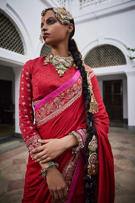 Red saree crafted from Moonga Tussar featuring zardozi and pita hand embroidered borders. Accompanied by an embroidered padded blouse with a floral pattern in silk jacquard.