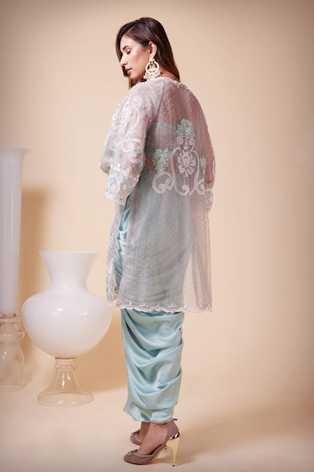Grey cape featuring bell sleeves with all over thread, sequin & Swarovski crystals applique embroidery. Paired with a draped skirt and padded blouse adorned with intricate embroidery.
