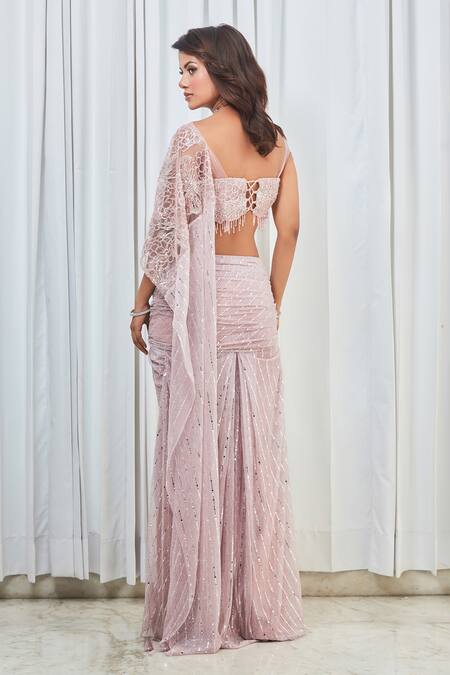 Intricate bead and sequin embroidery on blouse, Cold shoulder detailing on blouse, Pre-draped design for easy wear