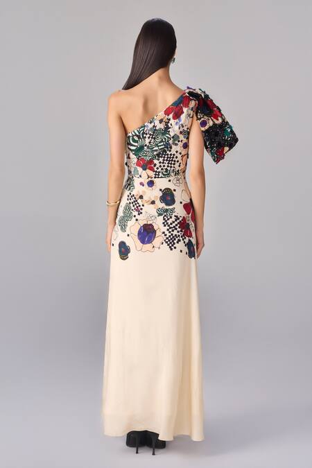 Multi-color one shoulder gown featuring floral and checkered placement prints