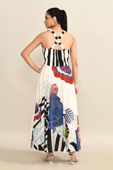 Off white midi dress featuring a sweetheart neckline and all over abstract floral motif prints